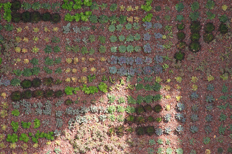Esta es la capa más delicada de la cubierta, en función de su elección se diseñarán los espesores y las características del resto de capas, por ejemplo, si queremos plantar un árbol necesitaremos como mínimo 1 m de tierra y una capa dreanante de un espedor y resistencia acordes. Si plantamos determinadas especies de sedum y crassulas podremos tener un espesor de sustrato muy pequeño…o incluso no tener sustrato como se puede ver en la cubierta de teja de la imagen.